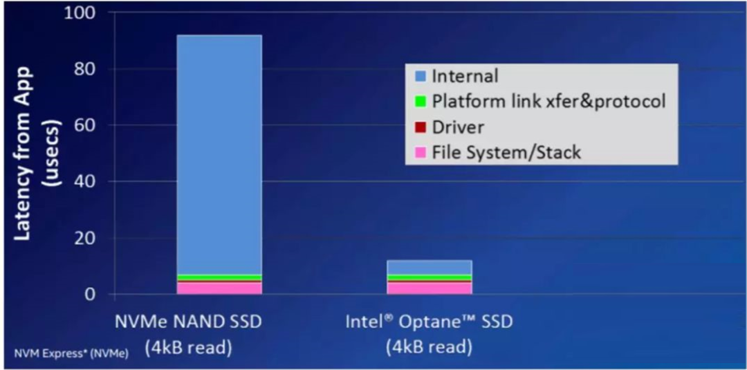 一个存储系统,并发度可以低,这不是问题,因为可以堆多套系统形成分布式架构来轻而易举的提升并发度,但是如果一个系统时延很高,那么基本上是很难解决的,因为导致高时延的原因之一就是I/O的软件处理路径过长,处理步骤过于复杂,而不管是砍掉路径上的处理模块,还是优化其中某个慢速步骤的处理速度,其花费的精力都非常巨大,甚至得不偿失。此时当然希望直接从底层硬件层面一劳永逸的解决问题,也就是利用极低时延的存储介质,一砖撂倒。