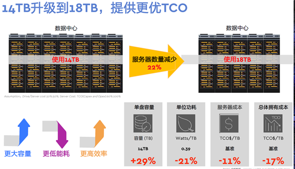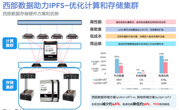 西部数据经过周全的考察和计算,力推用户从14TB容量点升级到18TB,能大幅降低TCO。西部数据公司副总裁兼中国区业务总经理刘钢在峰会上表示:“首先在IPFS层面,‘存算分离’已经是共识了。在计算集群里面,西部数据数据有7.68T的SSD,在存储集群里面,我们推荐用18T的高密度硬盘,当用4U60+18T这种配置,与原来传统的4U36+16T配置相比,机柜数减少了约46%,功耗减少了大约36%,大规模地降低了部署成本和运维成本。”