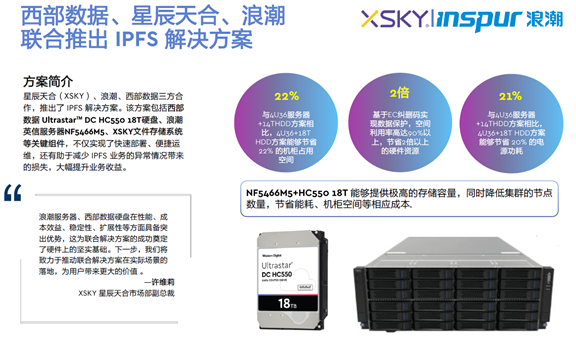 此外,西部数据积极联手生态伙伴,与星辰天合(XSKY)和浪潮联合推出了IPFS解决方案,与4U36服务器+14T HDD方案相比,4U36+18T HDD方案能够节省22%的机柜占用空间。在与杉岩数据的联合方案中,能够将服务器节点部署量降低到原有的47%,并能够降低36%的功耗。