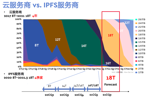 因此,IPFS的兴起直接带动了存储,尤其是分布式存储系统硬件的出货量。如果说激励机制是肥,那么存储介质就是土。在西部数据提供的市场数据中可以看到,IPFS服务商所使用的硬盘容量从8TB升级到18TB只用了1年,而传统云服务商的这个过程用了4年。