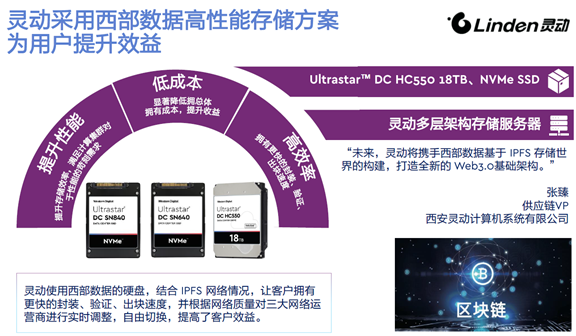 灵动是一家IPFS分布式存储服务器制造商,也是西部数据的生态伙伴之一。灵动也在计算机群和存储机群里面采用了针对快数据的存储方案和针对大数据的存储方案——西部数据的NVMe SSD和18T的高密度硬盘。