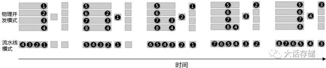 另外,这两个模式之间还有一个微妙的事情。假设该步骤的下游还有其他步骤的话,除非下游的步骤也是物理并发的,否则上一步的物理并发产生的起跑超前效应将会在下游步骤被屏蔽掉。如下图所示,一股脑先到达了目的,倒头来还得一个一个的经过下游步骤的处理,最终物理并发模式和多级流水线并发模式产生的吞吐量依然相同,同时每个物品到达时刻点也完全相同了。这好像龟兔赛跑,乌龟虽然一步一步往前挪,但是最后反而和兔子一起到达了终点。