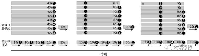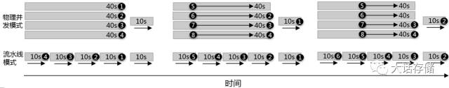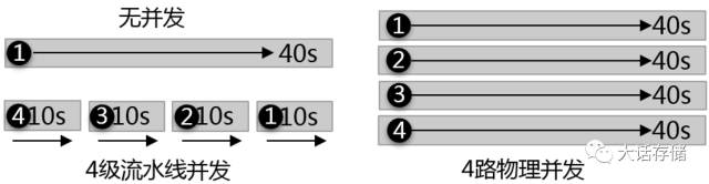 使用4级流水线并发和4路物理并发获取的吞吐量是相同的,只是方式有区别,前者是每10s出一个(每40s出4个),后者是每40s出4个。物理并发方式下,当第一轮传递开始之后的40s,会有4个物品传出;而4级流水线并发模式下,传递开始后40s却只有1个物品被传出。