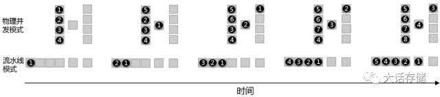 从该图可以看出,多路物理并发模式的起跑天然比流水线模式要快,但是跑起来之后,两者的速度是相同的,实际中可以忽略这个起跑差异,毕竟这并不是比赛。我们把第一个物品从流水线进入到传出的过程叫做入流水阶段,此过程中,流水线会被充满,一旦充满,流水线就可以全速运行,也就是全并行阶段。正是因为流水线必须先被充满之后才能全并行,所以导致了其比物理并发模式起跑慢。