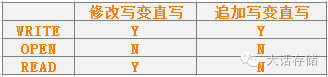 该 AS13000 研发工程师出场了。其给出设计思路如下:在保证多点并发访问数据一致性的前提下开启写缓存模式。经过分析之后,确定其他节点 OPEN , WRITE , READ 某个文件时,该文件的写缓存不得不改变为 Write Through 模式以保证数据一致性。但实际上, OPEN 本身不会对写有影响; READ 对追加写没有影响,但会导致修改写变为 Write Through 。具体如下表: