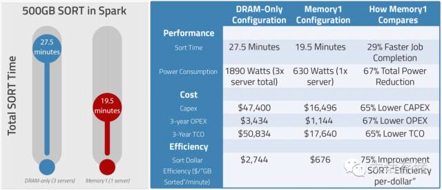 比如,Apache Spark 以及内存数据库场景。在大数据领域里,Spark便是一个极度依赖内存容量的应用。Spark必须实现尽快的完成对数据对象的创建、缓存、排序、分组、结合等操作,这些对数据对象的处理过程都在内存中进行,访存频率非常高,对内存的容量和速度非常敏感。尤其是排序操作操作,其速度起到关键作用。