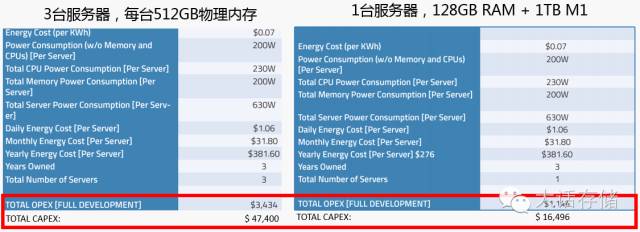 不妨先来核算对比一下这两个系统的3年的CAPEX和OPEX。可以看到,传统配置的总体拥有成本=$3434+$47400=$50834,而相比之下,M1的配置只有$17640。