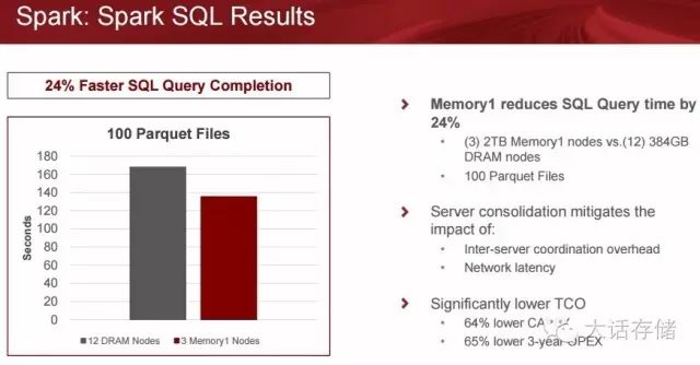 SPARK SQL : Memory1 可以显著提升大数据量的效率和集群规模。 在12个节点的(每节点384GB 内存)SPARK SQL集群运行一个100K 的SPARK SQL PARQUET 的文件, 和3个节点的(2TB M1) 对比, 结果是M1 可以减少24% 的JOB COMPLETION 时间, 成本节省超过一半, 集群节点数节省75%。