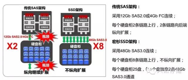此外,宏杉科技MS7000AF固态存储系统还在底层硬件上做了专业的优化来专门适配全固态场景。我们知道,传统的存储系统后端通路一般只有x4 SAS宽端口,也就是每个控制器通过x4通道的SAS链路连接到JBOD,这条x4链路会极大的限制固态盘的性能。我们知道,宏杉科技的存储系统的一大特色就是后端采用SAS全共享架构,JBOD拥有8条x4宽端口用于上联到控制器,充分释放了后端SSD的性能。这一点则是其他基于SAS/SATA SSD所构建的全固态存储的硬伤之一。