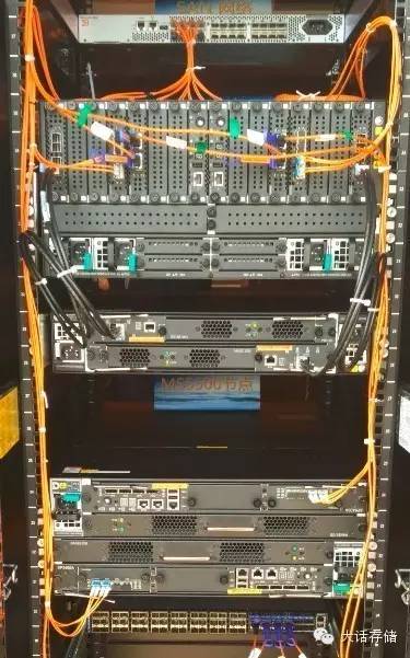 最后,让我们观摩一下CloudSAN架构对应的实际部署拓扑。 下图所示,顶端是一台FC交换机,最底下是一台40GE交换机。二套SAN存储机头节点(一个节点是机头带扩展柜,一个是机头与扩展柜一体化),后端连接到以太交换机上,前端连接到FC交换机上。
