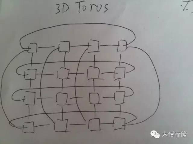 NoC 有很多链接方式,比如下面这种就被称为3D Torus网络,如图6所示。超算领域也需要将大量CPU连接到一起,也是使用这种方式,只不过超算领域的网络拓扑更多样,比如Fat Tree,HyperCube,FullMesh,Torus,Butter,以及各组合。所以,把众核心芯片称为片上HPC,也不足为过。