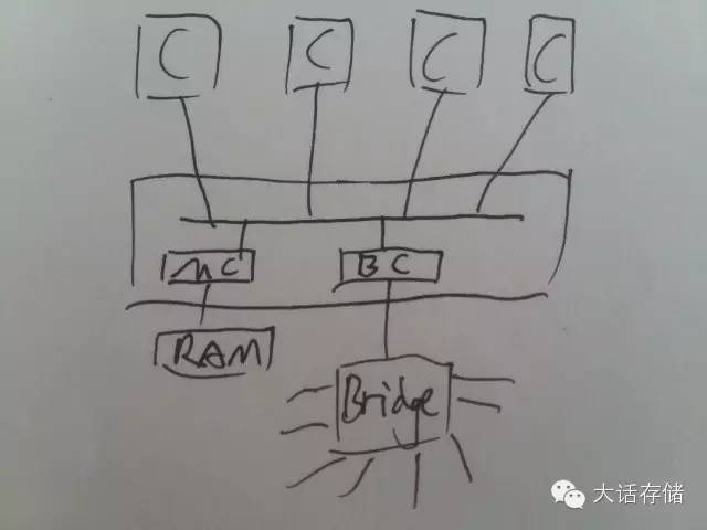 多CPU在早期是通过一个共享总线比如FSB连接在一起,同样挂接在FSB上还有内存控制器,桥控制器等,这种多个CPU共享访问集中的RAM的架构成为SymmetricMulti Processor(SMP)架构,或者UMA(Uniform Memory Access)架构。如图1所示。