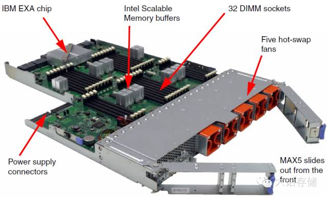 值得一提的是,在这个交换矩阵中,不一定非得用CPU内部的环线来挂内存,可以用任何方式将内存接入这个矩阵,也可以在这个交换矩阵的任何地方放置一个或者多个MC,挂一堆内存,然后用MC-QPI桥片接入QPI交换矩阵即可。典型的代表就是IBM x3950 x6产品系列中有个专门的1U箱子,里面全是内存。如图3所示。