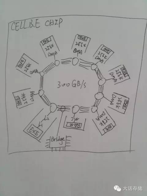 其在同一颗芯片中集成了8个支持128位SIMD的专用RISC核心,以及一颗PowerPC通用核心,再加上内存控制器、IO控制器,所有部件连接在一个Ring环线上。如图4所示。
