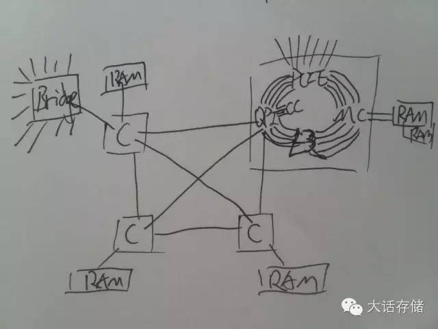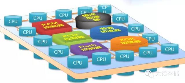 凡是追求高并行度的,大量工序协作的专用场景,都可以用众核心处理器。PMC-Sierra公司的Flash控制器就是一款16核心众核处理器,采用2D Full Mesh NoC,16个核心连同PCIE控制器、Flash通道控制器、DDR控制器、多种硬加速器一起分布在该NoC上,采用消息机制传递数据,支持以IO方式访问RAM,也支持直接将外部RAM空间映射到本地地址空间访问,难能可贵。至于其固件是如何在16个核心上分配的,冬瓜哥就不继续展开了。冬瓜哥画了一张图如下,如图7所示。
