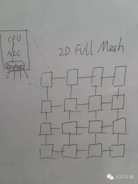 核心越来越多,如何来将这么多CPU核心之间、以及核心与RAM之间、以及核心与其他IO控制器之间,连接起来,成了一门独立学科——Network on Chip(NoC)。上文中所述的Cell处理器,其NoC就是Ring环线。如果是几百个核心,比如256核心/节点,利用Ring就不合适了,这个Ring网络的“半径”就是128,意即任何一个节点发出的消息,最差情况下要经过128次传递才会到达目标节点,时延太高,无法消受。所以,业界通常使用2D FullMesh网络来连接如此多的部件。如图5所示。
