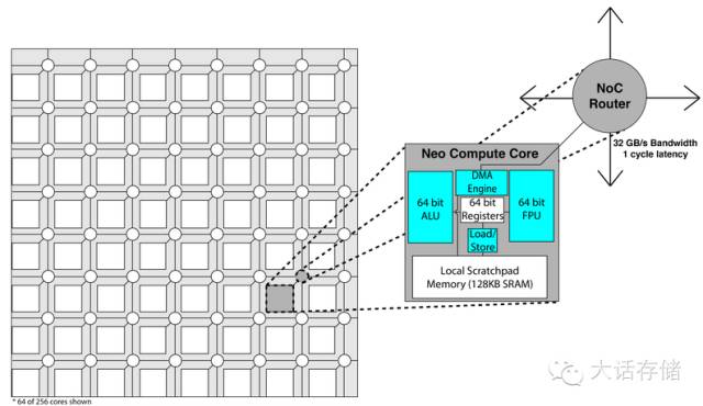 “The Neo architecture addresses these problems by removingunnecessarycomplexity from hardware, resulting in smaller chip area and lesspowerconsumption, instead providing similar functionality more efficiently in arichsoftware toolchain.” “Wehave rethought computing architecture from theground up to design our Neo chip,featuring a completely new core design includingsoftware managed scratchpadmemory, 256 cores per chip, a mesh network-on-chipand a high bandwidthchip-to-chip interconnect.”
