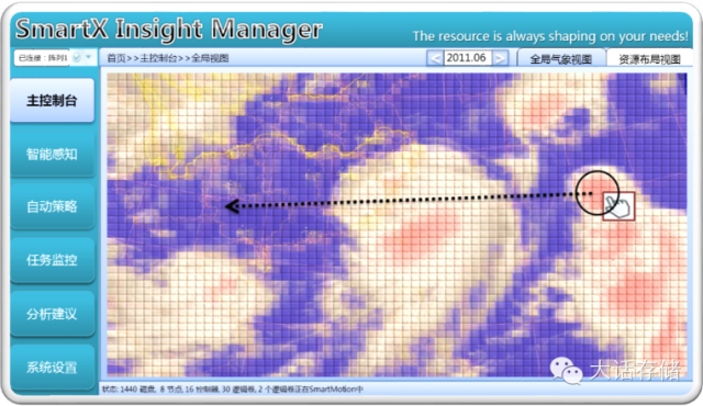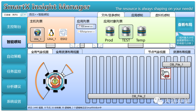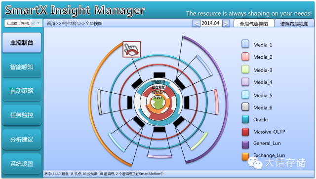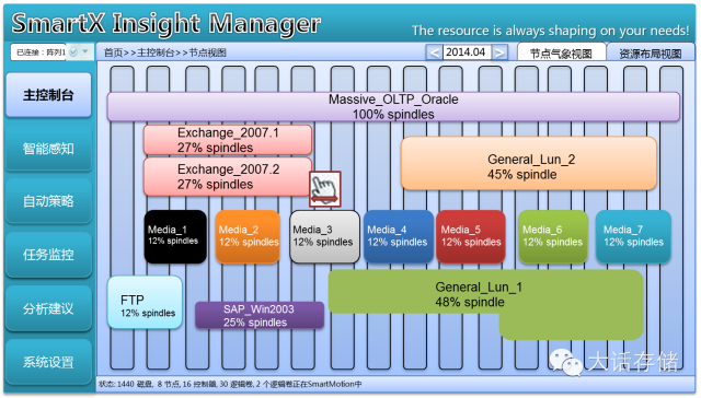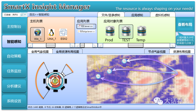 人的创意是无限的,就看谁YY能力强。如果能够像 像指挥战场一样指挥全局数据,让用户有一种强烈的掌控感、大局感和代入感。进入总指挥台,感受到的不是需要做那千篇一律流程化的配置,而是产生一种运筹帷幄决胜千里的感觉。有一点需要铭记的是,用户永远都是从上往下看的,也就是从IO路径的源头看下去到IO路径的终点,谁让用户看得远,最好能一眼望到底看透,就爽,如果看不到底看不透,那就不爽。整个指挥台是一个可视化可操纵的集合体,对各种流程 端到端可视化展现。比如当操作SmartMotion的时候,就像在指挥一只大部队调动,当有选择性的将某块数据提升到SSD的时候,应该有一种从憋屈的坦克装甲车出来直接进入战斗机一样的感觉。这要求界面中加入一些动态元素。在充分YY之后,提出如下大方面需求: