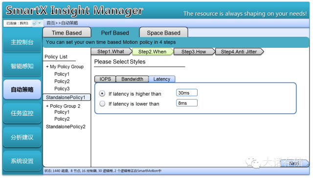 在基于性能的配置步骤下,其他与基于时间的类似,唯独“When”不一样,比如图2-4-14所示,可以从IOPS、带宽、时延三个唯独来设置触发阀值。“How”部分同上文。