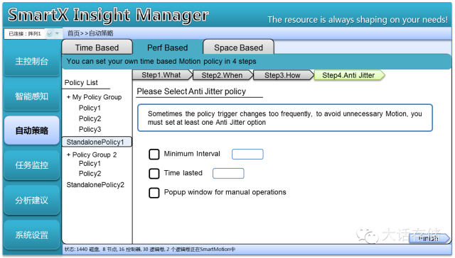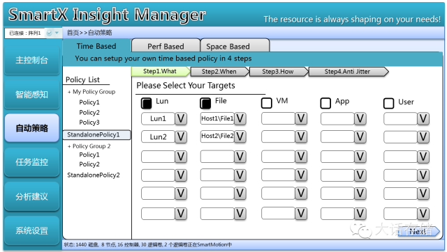自动策略部分,不仅要体现根据时间触发的用户自定义策略,而且要做到真正的智能自动,也就是系统可以根据当前的资源利用情况,智能的做动态SmartMotion、Tier和QoS。可以从时间触发、性能触发和空间触发三个维度来设置,设置分四步走,第一步选择要调控“什么”,第二步选择“什么时机”触发调控,第三步选择“如何”调控,第四步选择防抖动措施。如图2-4-12和2-4-13所示为基于时间的自动策略设置,首先新建一条策略,然后在该策略第一步中可以同时选择多个调控对象,第二步是选择触发时间(没什么特殊的地方所以不贴图了)。