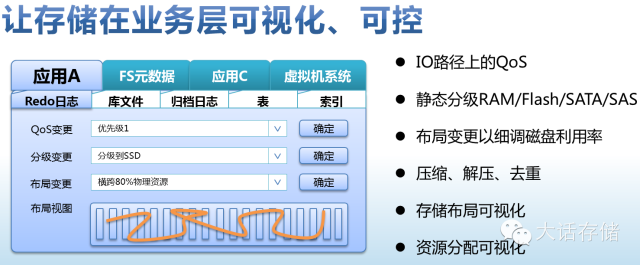 5. 可以设定将哪些逻辑资源展示在主界面,不仅可以展示逻辑卷,还可以展示应用对象,比如某个数据库里的某个库,因为存储系统可以通过主机端感知代理来获知一台主机上的包括文件、所支持的应用、虚拟机等数据对象,用户点选这些要展示的对象,存储系统会请求感知代理将这些对象占用的底层块列表推送过来,然后分析这些列表就可以得知该应用对象在存储系统内的物理分布状况,从而显示在主界面。
