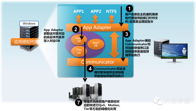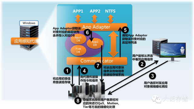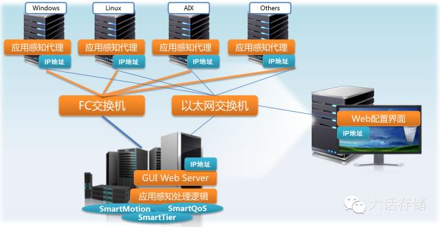 我们可以看到,应用感知是不可能靠存储系统自己就感知了的,存储没那么智能,不管是SmartMotion、自动存储分层还是QoS,要做到精细化的应用感知就必须依靠主机端的Agent来向存储系统提供对应的信息。所以,对这套产品的架构设计应该是图示的拓扑最合适: