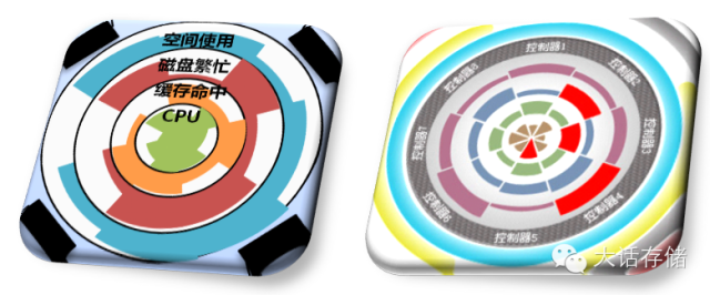 将主控制台切换到资源布局视图之后,整个视图由物理展现方式改变为逻辑展现方式,如图2-4-6所示。这里相比气象视图来说会有种水落石出的感觉。图示是一个8节点16控制器的集群SAN存储系统。这张图的灵感来源于蜘蛛网,不过是一个经过仔细布局的蜘蛛网,这里只是示意图,不追求美观。8个长方形色块表示8个节点,围成一个圈,这个圈内部,有4个套圈,中心的圈表示CPU利用率,由于有8个节点,每个节点占据这个圈的1/8扇区,用色块在圈的半径方向上的高度来表示每个节点的CPU利用率,同样,缓存命中率、缓存使用率、磁盘繁忙程度、空间使用率、带宽使用率、IOPS、时延等等IO参数,都可以在这些圈里展现出来,但是受限于空间,考虑只提供四个圈,可以通过设置将上面这些参数任选4个展示在界面中。这些参数在界面中是动态刷新的,比如后台可以是5秒一次,但是前台可以做成平滑的动画形式加强用户体验。如图2-4-7所示,左侧为Powerpoint制作的原始图,右侧为美工之后的图。