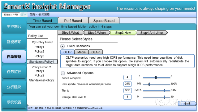 第三步选择如何具体调控措施,这里给出“固定场景”和“高级设置”两条路可选,选择固定场景,那么系统会按照一刀切的形式用写死的参数来做调控,比如OLTP就直接保证该卷跨越最大磁盘数,最高的Tier层级以及QoS。Media和OLAP则是另一套参数。高级模式里就是纯手控模式,可以调节包括将对应资源跨越多少节点,每节点跨越多少比例的磁盘,以及所处层级和QoS级别。