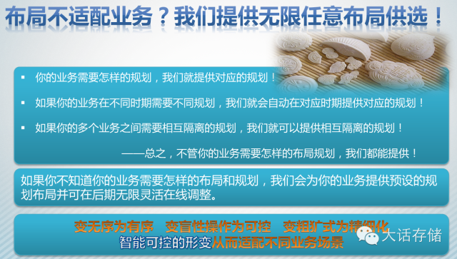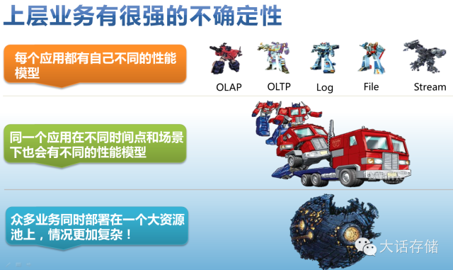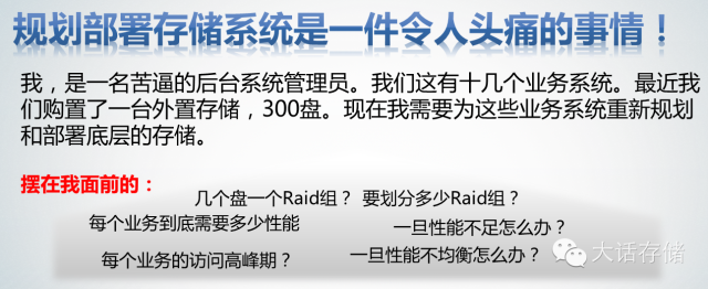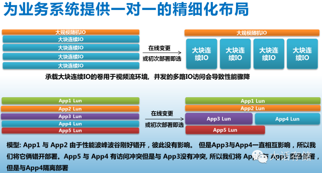 逻辑卷形变技术解决的不仅仅是多个逻辑资源之间的冲突,释放了被禁锢的性能,它其实更解决了一个运维方面的老大难问题,那就是“谁也说不清应用到底需要多少性能”的问题。我相信任何一个IT管理员在部署和维护存储系统的时候都遇到过这种问题。应用管理员懂应用,但是不见得了解这个应用的压力到了底层到底需要多少块盘来承接。而存储管理员的任务就是做Raid然后建逻辑卷,几乎也不会知道每个应用到底给多少盘合适,只能凭经验,于是应用和底层管理员开始扯皮扯来扯去。这几年我倒是发现一个经验,就是越是水平高的越不扯皮,因为都知道问题在哪该怎么做从哪入手,然后各自提供各自的信息;越是水平低的,越不知道问题出在哪该怎么办,不知道该干什么,那就只能先扯扯皮让老板看看自己没闲着。扯到最后了,该出结果了,于是干脆直接所有企业内业务的逻辑卷统统跨所有盘分布一了百了。这样势必导致冲突。当你发现性能冲突的受不了遭到投诉之后,怎么办呢?有个办法是加更多的盘,冲突就冲突把,加到1000块盘,冲突掉500块盘,至少还能体现出500盘的性能,存储厂商乐了,快来买盘吧,一台不够用再买一台吧,发啦!懒人有懒办法,但是我们不能放任之,不能因为你有钱就可以多喘气污染空气了。