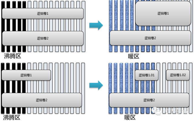此外,灵活形变,还可以达到降温效果,比如,在图1-3-5左侧,可能这两个逻辑卷的左半部分都是频繁访问的部分,而右半部分却少有访问,他俩恰好产生了热区叠加效应,那么就可以将逻辑卷有的放矢的变形,以避开热区,最终达到均衡效果。变形后可以保持连续,也可以分拆为多个块,因为Raid2.0是可以再条带Segment级别拆分的。