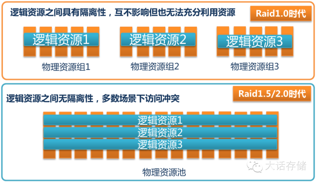如图1-3-1所示,不管是Raid1.0/1.5/2.0时代,逻辑卷,也就是Lun,在整个Raid阵列上的的数据分布是完全没有任何优化的,也没有针对任何场景区分对待。Raid1.0时代,每个Lun之间相互隔离互不影响,而且各自可以通过调节条带宽度来实现不同应用场景,这一点还算合理,但是代价是每个Lun的性能也是受限的,因为一个Lun只能分布在一个Raid组上,那时候一个Raid组最多也就是十几块盘。Raid1.5/2.0,用数百块盘实现一个Pool,所有的逻辑卷全都平均分散在所有盘上,虽然单个Lun看上去性能最大化了,但是多个Lun之间并没有实现隔离机制,这在很多场景中,直接导致了访问冲突。这尤其体现在那些接受大块连续地址IO的逻辑卷上,由于横跨整个阵列,不加节制的大块连续IO将耗费阵列中所有磁盘的磁头为其服务,其他所有共享这个阵列空间的逻辑卷的性能均受到影响。这就是一锅粥乱糟糟带来的后果。