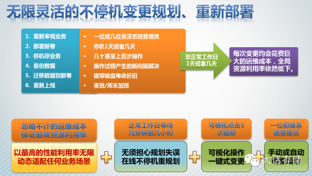 我们可以看到,这个老大难问题主要是因为两个原因,第一是缺乏高手。第二是存储厂商偷懒,不提供差异化的部署方式,因为与其投入人力研发耗费成本,不如放之任之,这样用户不得不买更多的盘,买更高的配置。有了这个技术,管理员再也不用后怕任何初期的规划失误了,先上线运行着,然后不断的摸索出到底哪个应用需要多少性能,然后手动或者自动的重新布局所有已分配的逻辑卷资源,而且不影响业务运行。岂不快哉?