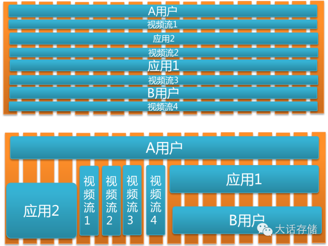 凝视一下1-3-2图上半部分,你会发现它对逻辑资源排布的很不讲究。4个视频流逻辑卷竟然被几个其他逻辑卷隔开,这是典型的没事找事,要知道当多路视频流并发访问的时候,磁头就要摆动更远的距离来同时读写这几个逻辑卷,对于这种排布设计,看了很是让人恼火,太不讲究了,粗枝烂叶,不可取。实际上,这种情况是没法用什么算法彻底去解决的,必须从本源上解决。
