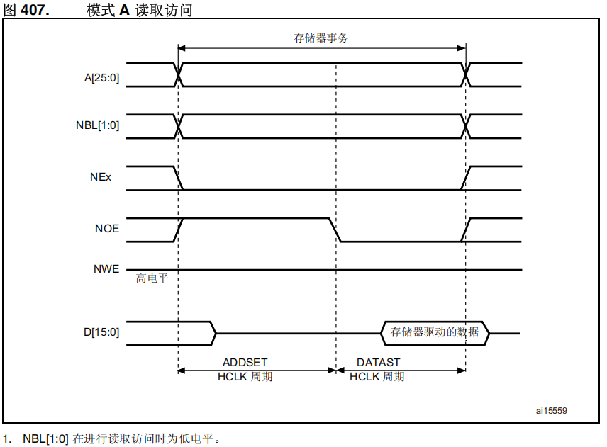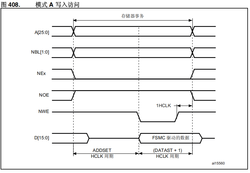 FSMC外设支持输出多种不同的时序以便于控制不同的存储器,它具有ABCD四种模式,常用模式A。