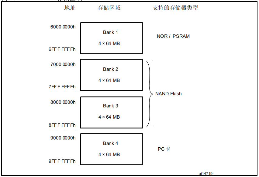 从 FSMC 的角度,外部存储器被划分为 4 个固定大小的存储区域,每个存储区域的大小为