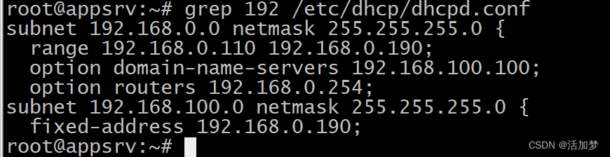 root@appsrv:~# vim /etc/dhcp/dhcpd.conf
