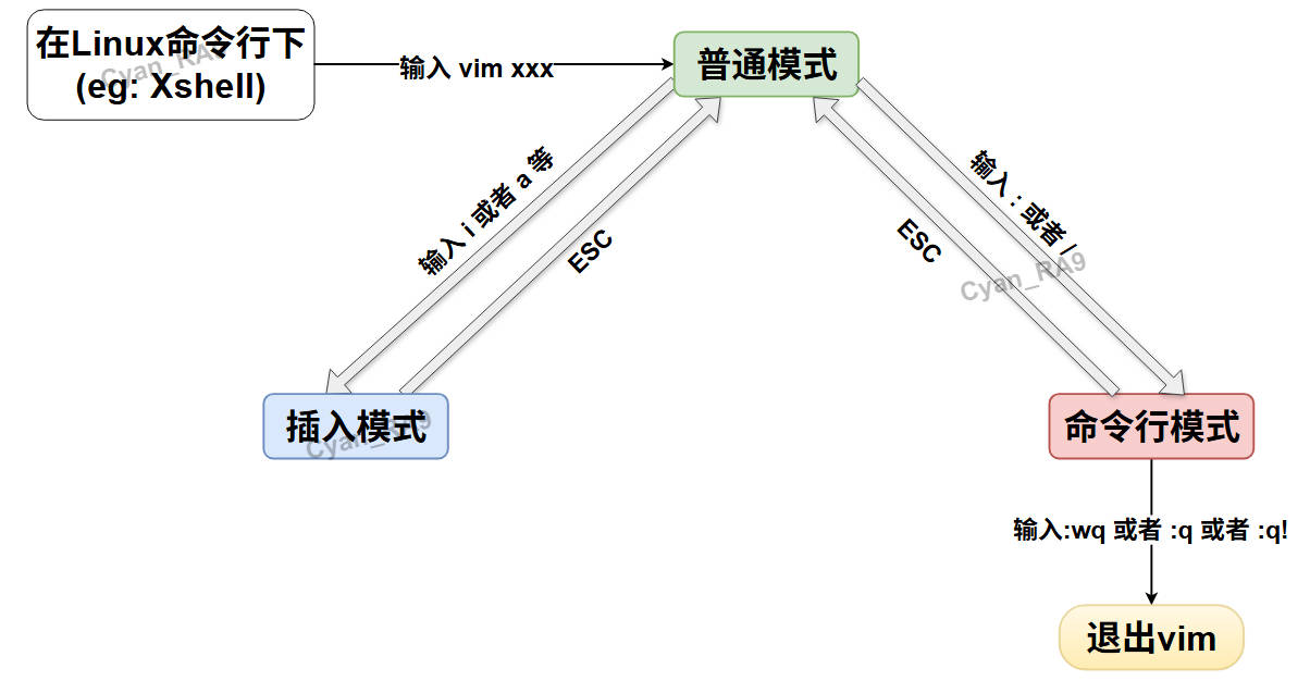 - 文章的重点是Linux vim的三种模式, 以及模式之间的切换。注意——插入模式是不能直接进入命令行模式的,必须先通过ESC回到普通模式(一般模式),再从普通模式输入 : 或者 / 进入命令行模式。