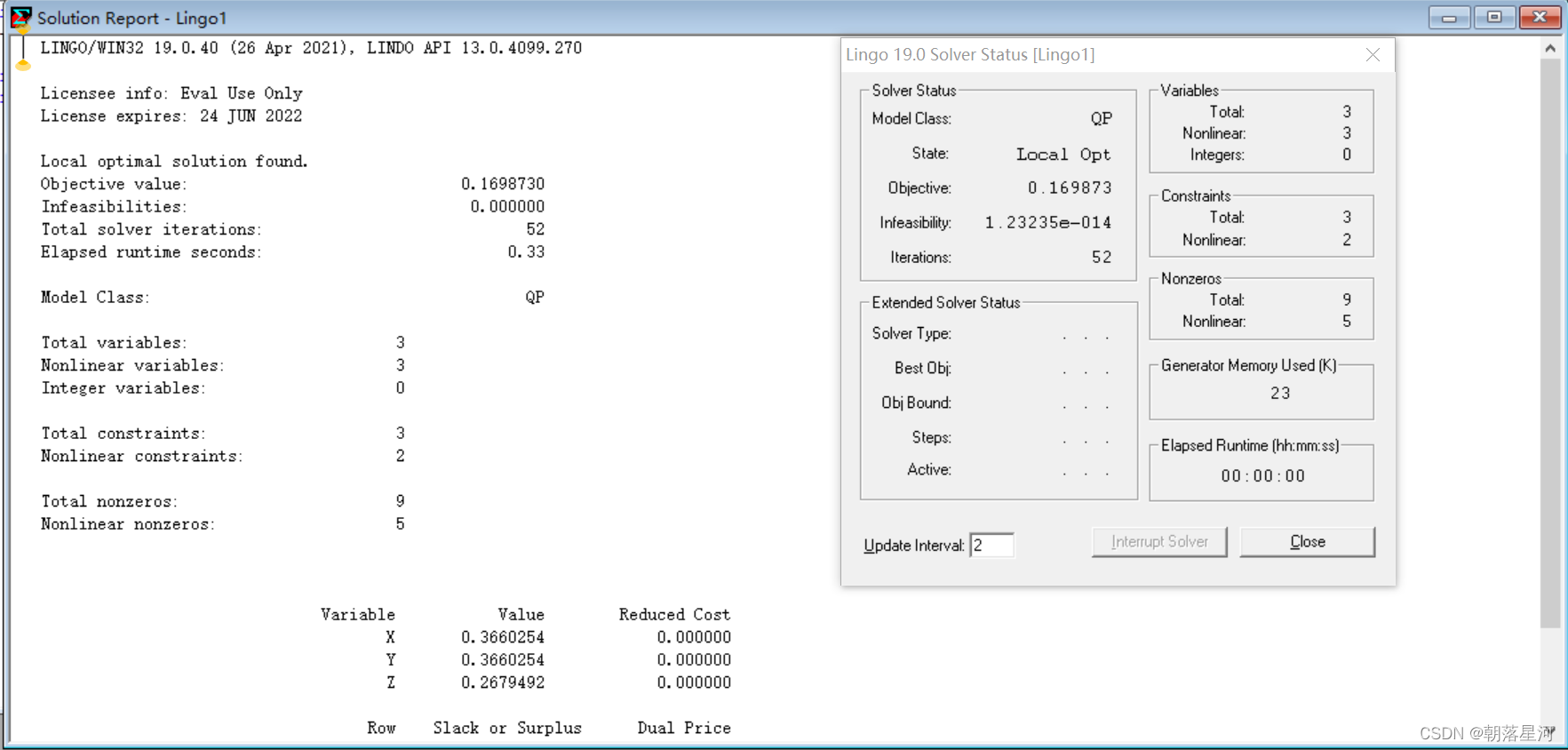 PS:LINGO中默认所有变量都是非负的,这里的 x, y 的取值可正可负,所以使用@free函数
