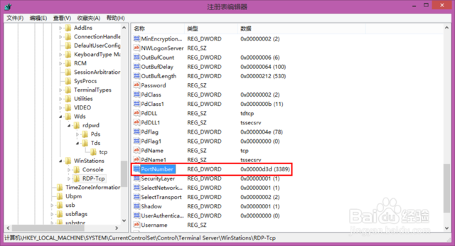 继续打开Terminal server文件下列出的winstations文件下的“RDP-tcp”选中RDP-TCP文件,在右边找到“PortNumber”双击打开;