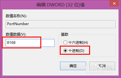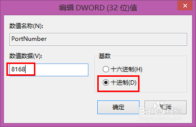 在打开的编辑页面中基数处勾选十进制,在数值数据输入你要修改的端口号,默认是3389,这里我改成了8168;修改完成点确定;