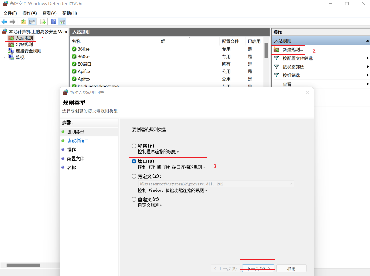 5.新建端口入站规则。