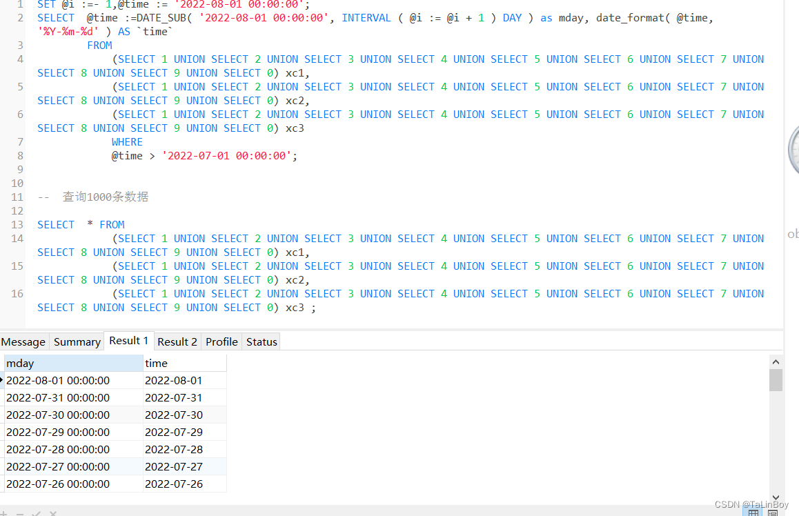 该查询语句用于按天迭代日期,从'2022-07-01'开始,直到'2022-09-21'之前,展示日期格式化的结果。通过将原始多表联合查询改写为单次DATE_ADD操作,提高了效率并简化了逻辑。