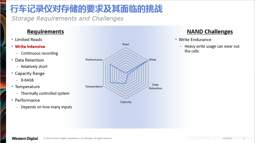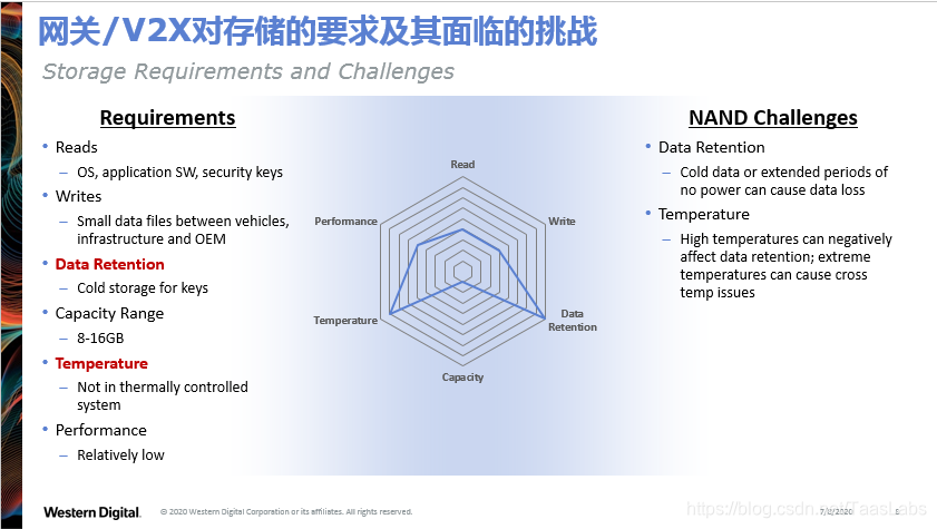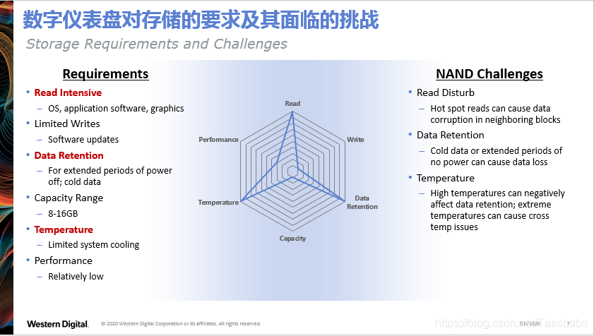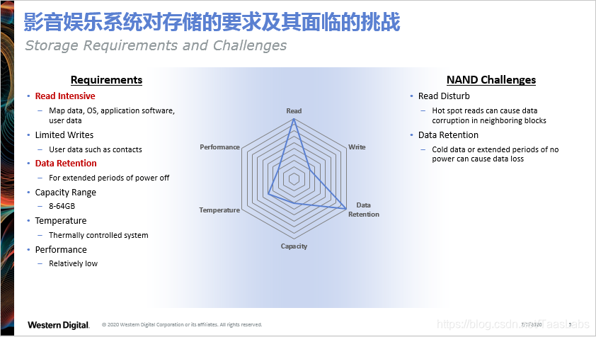 Eric接着为我们介绍了影音娱乐系统对存储的要求及挑战,他表示影音娱乐系统虽然不会像手机操作系统一样,客户会频繁下载和删除应用以及一些影音文件。其不同之处就在于使用频率,汽车和其他消费电子不同可能会有一些情况有很长一段时间处于一个不开机的状态,所以对于数据保持力具有一个比较高的要求。