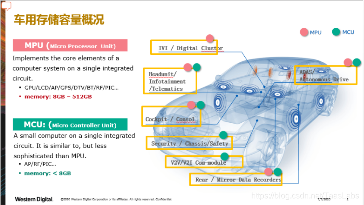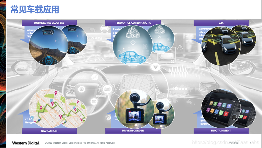 来自西部数据的资深市场经理额日特先生Eric首先为大家介绍了现在车载存储的现状,他指出目前常见的和车载存储相关应用分别有抬头显示、数据仪表盘、网关、v2x、行车记录仪、影音娱乐系统和智能座舱。