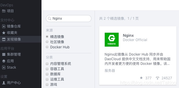 在DaoCloud官网注册登录后,在「发现镜像」中搜索‘Nginx’,搜索结果中有Docker官方提供的Nginx镜像,如下: