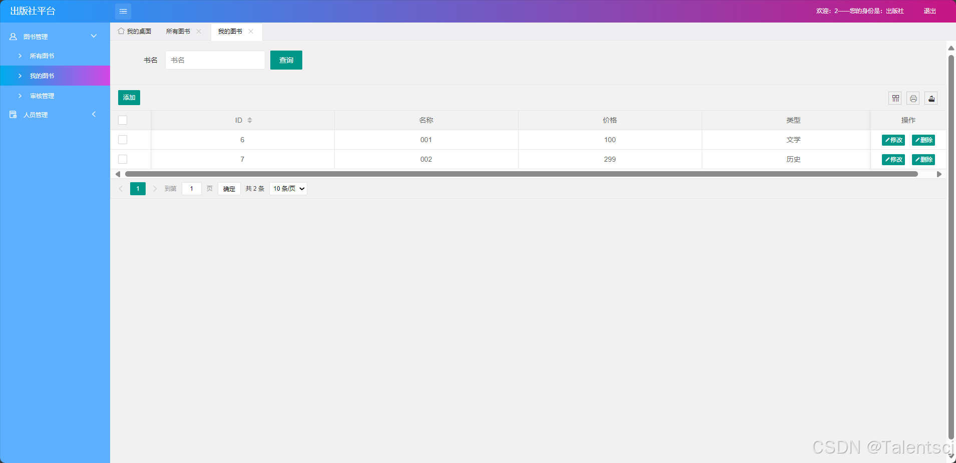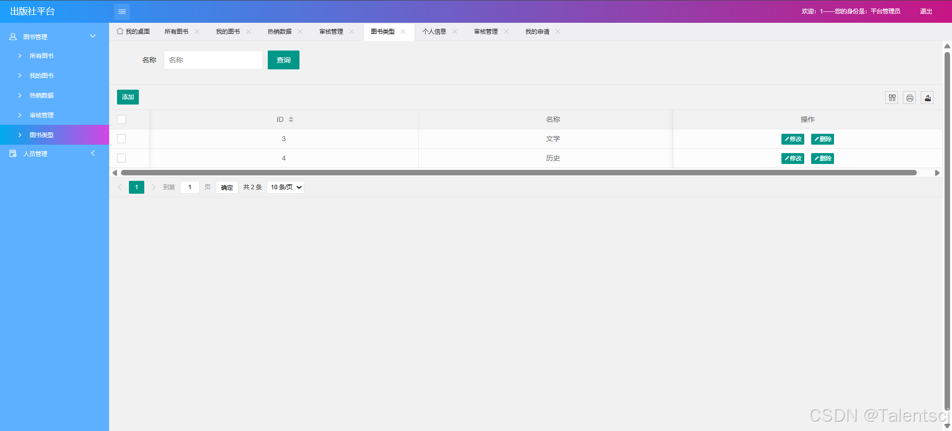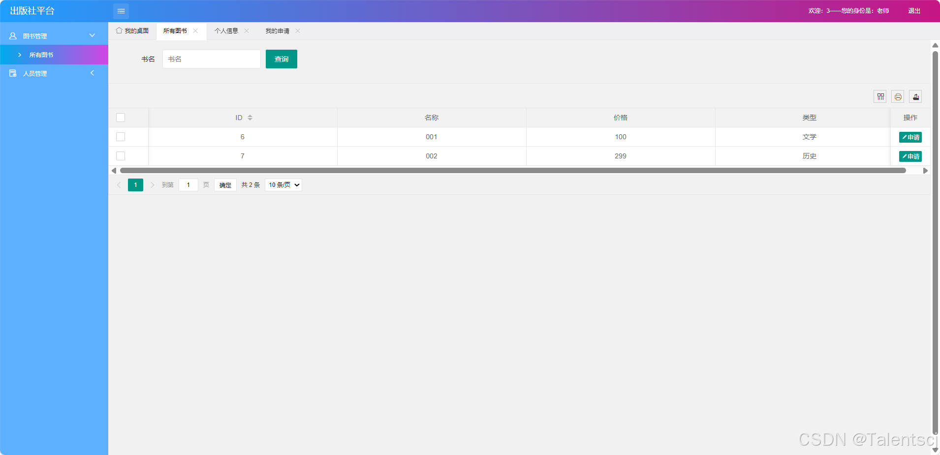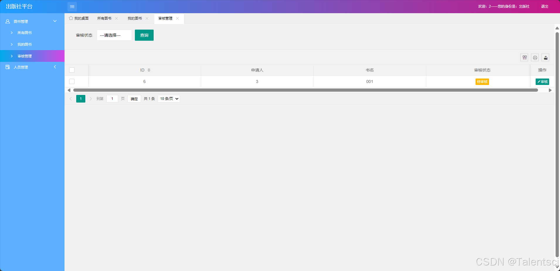 出版社平台管理系统是一个基于SpringBoot框架开发的Web应用程序,旨在为出版社、教师和平台管理员提供图书出版管理的全流程服务。系统采用MySQL数据库存储数据,实现了图书管理、用户管理、申请审核、数据统计等功能。
