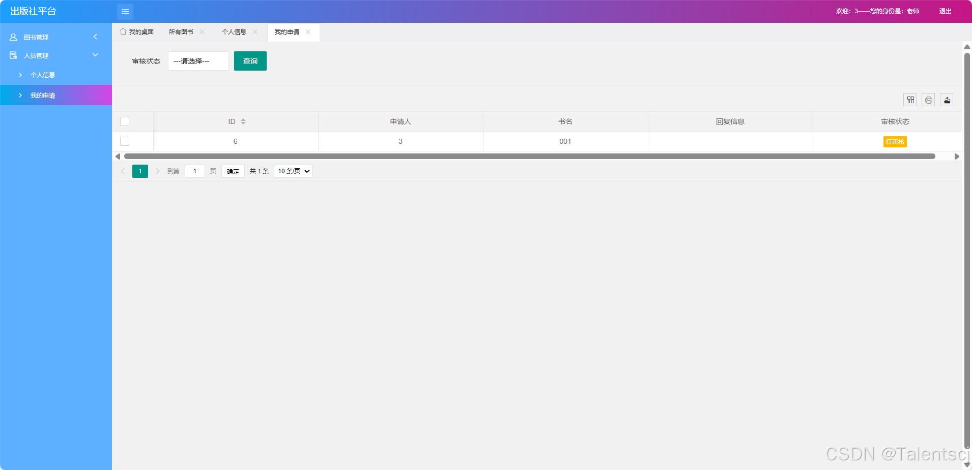 字段:关联ID、教师ID、图书ID、状态、拒绝理由、作者ID、申请年月