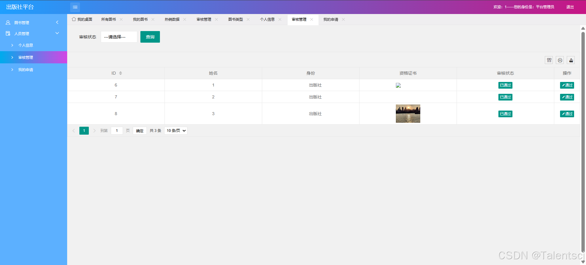字段:用户ID、名称、密码、类型、月/年出版限额、资格证书图片、审核状态