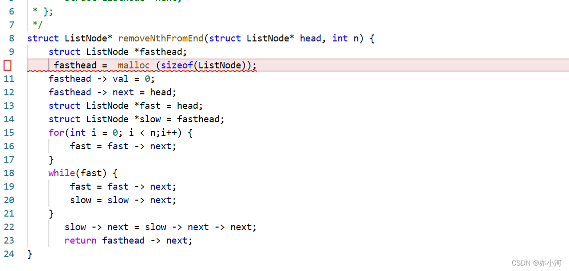 3.删除倒数第n个元素。即快慢指针相隔n个元素来计算删除倒数第n个元素,移动快指针n格