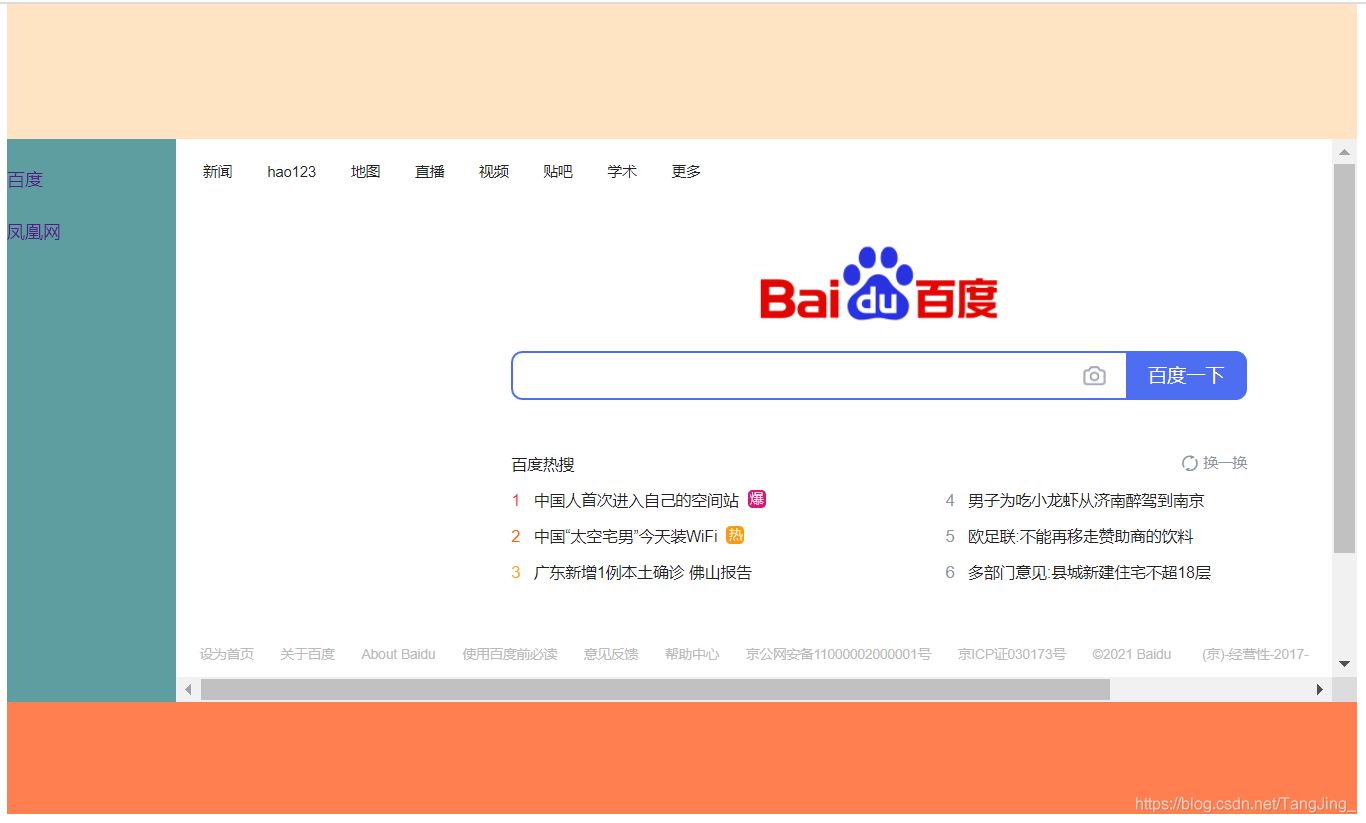 分析:制作一个简单的盒子模型,将网页分为几个板块,点击文字可跳转到相应的网站,并将其放在盒子中间位置。